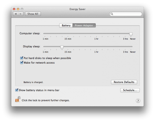 Após a instalação do NoSleep ainda é preciso alterar o MacBook para não entrar no modo Sleep após um certo período de inatividade. Para isso é só ir na seção Economia de Energia (Energy Saver, em inglês) do painel de preferências e configurá-lo para tal. Conforme a figura abaixo.