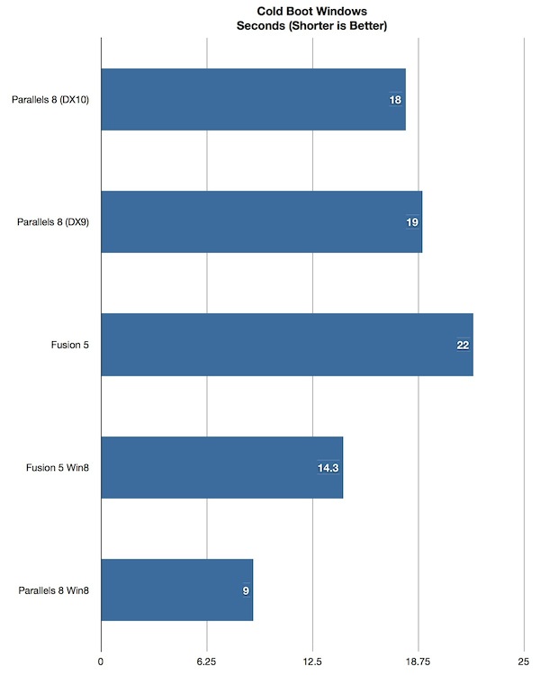 O segundo ponto importante para que está acostumado a trabalhar com essas ferramentas de virtualização é o tempo de inicialização da máquina virtual. De acordo com o trabalho do Mac Observer o Windows 8 virtualizado usando o Parallels, em sua nova versão, tem o tempo de boot de 9 segundos, enquanto o mesmo SO rodando através do VMWare Fusion 5 demorou quase 15 segundos para estar apto para o trabalho.