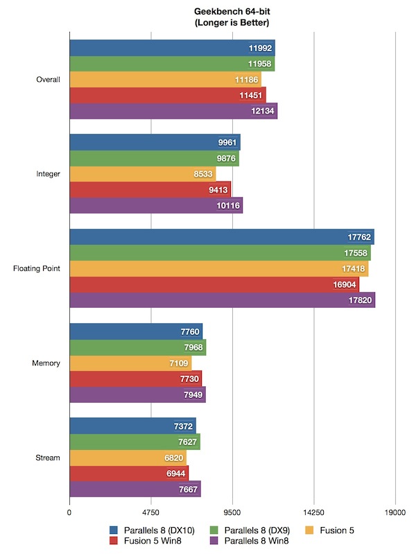 O site Mac Observer fez um extensivo trabalho de benchmarking usando diferentes tipos de algoritmos e testes entre as duas ferramentas com a nova versão do sistema operacional da Microsoft. Importante frisar que as características das máquinas virtuais eram as mesmas.